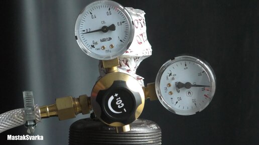 Если при сварке полуавтоматом вы используете редуктор с манометром, то рабочее давление выставляем на отметке 0.2 МРа (манометр низкого давления-слева). С права манометр высокого давления, который показывает давление в баллоне. Данное давление 0.2 МРа может меняться от условий в которых производится сварка. Например при сварке на улице, где большая вероятность появления ветра, давление можно увеличить. Также давление на манометре низкого давления выставляется с учетом режима сварки. ( простыми словами, чем больше обьем вы свариваете, тем больше выставляем давление газа)...