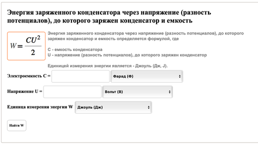 Энергия заряженного конденсатора. Калькулятор онлайн для любых конденсаторов.