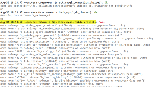 Если при проверке сайта увидели ошибку что не верная кодировка таблиц, или не удалось проверить структуры базы данных из-за ошибок кодировки, а в подробном отчете записи похожие на это: Кодировки таблиц в БД (check_mysql_table_charset): Fail Кодировка таблицы "b_catalog_agent_contract" (utf8mb4) отличается от кодировки базы (utf8) То поправить можно достаточно просто. Открываем несколько вкладок со страницей выполнения sql запроса в админке сайта -/bitrix/admin/sql.php Для этого выполняем запрос...