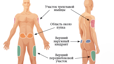 На этом изображении указаны места в которые можно делать внутримышечно уколы, для этого используют одноразовый шприй с ёмкостью от 5 до 20 мл в комплекте идёт игла нужного диаметра, вводят раствор медленно...