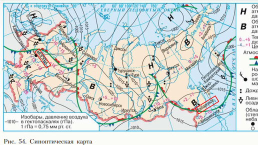 1. Найдите на синоптической карте города Москва и Хабаровск. 2.Определите в каких областях атмосферного давления находятся Москва и Хабаровск. (Город Москва находится в области низкого атмосферного давления (циклона) , город Хабаровск - в области высокого атмосферного давления (антициклона)). 3. Определите температуру воздуха в городах. (Температура воздуха в Москве+13…+15 , в Хабаровске +2…+7 градусов Цельсия) 4.Определите облачность (степень покрытия неба облаками). (Облачность в Москве 10 баллов, в Хабаровске 5 баллов)...