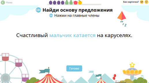 🎯 Хочу поделиться с вами полезной информацией о подготовке к ВПР вместе с Учи.ру - популярной образовательной платформой для школьников. 📖 В этой статье "Главный член предложения – подлежащие". 🚀 Итак, давайте начнем... Найди основу предложения. Нажимай на главные члены. Счастливый мальчик катается на каруселях. Счастливый мальчик катается на каруселях. В предложении говорится о мальчике. Мальчик. Это главный член предложения - подлежащие...