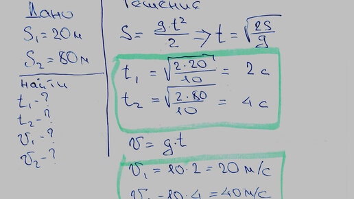 Задача: Два тела свободно падают: одно - с высоты 20 м, другое с высоты 80 м. С какой скоростью приземлятся тела? Определить время падения. Решение: Свободное падение, падение под действием силы тяжести, и Vo=0. При свободном падении, мы наблюдаем равноускоренное движение. Путь S при равноускоренном движении определяется по формуле S=Vo*t+a*t^2/2, (напоминаю в данном редакторе значок ^ означает степень, в нашем случае t в квадрате)...