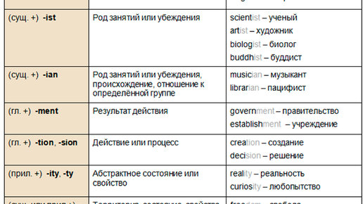 Сводная таблица суффиксов существительных английского языка