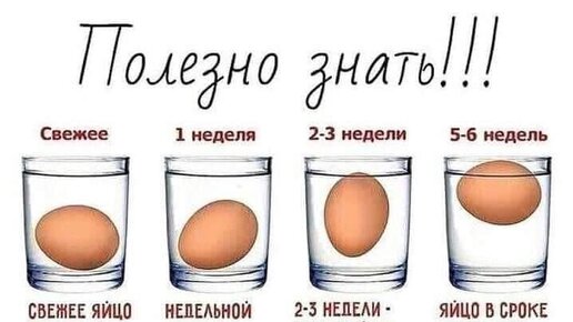 Проверка свежести яиц в воде • лежит на дне на боку – свежайшее, недавно снесенное; • под углом: острый носик на дне, тупой всплыл – яйцо недельной давности; • стоит посередине стакана тупым кончиком вверх – яйцу две-три недели; • плавает на поверхности – тухлое...