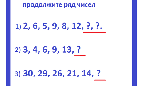 Приветствую читателей и подписчиков канала Тесты_математика! Числовые головоломки очень популярны и интересны. лгоритмы формирования чисел различны, и поэтому каждый интересен по своему. Ознакомьтесь с этими тремя числовыми рядами. Решайте каждую в отдельности. Галерея с решением. Кто решает самостоятельно, может не смотреть решение, но и запомнить алгоритм тоже непросто...