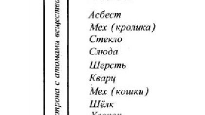 Знак заряда тела в результате электризации определяется тем, отдало тело электроны или их приняло при трении. Если тело приняло электроны — тогда оно заряжается отрицательным зарядом. Если тело отдало электроны — тогда оно заряжается отрицательным зарядом. Приняло или отдало тело электрины трении можно узнать по энергии связи электронов с ядром для различных материалов. Ниже приведен ряд материалов — в порядке возрастания энергии связи электронов с ядром...