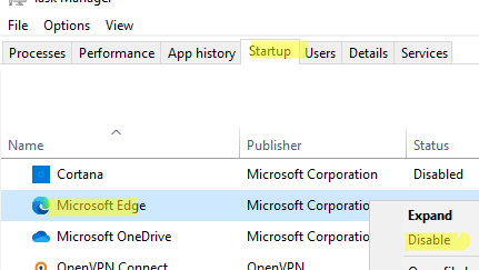 Отключить автоматический запуск браузера Microsoft Edge при входе в Windows