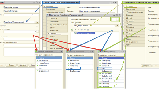 План счетов - синтетический учет Добавляет измерение счет в движения регистра бухгалтерии. Движения по счетам - это синтетический учет. ПВХ - аналитический учет Чтобы добавить аналитику к счетам (конкретный товар, контрагента и т.д.) используют субконто, которые реализуются с помощью плана видов характеристик. Чтобы задать: одинаковое значение ресурса, как для счета дт и счета кт (флаг установлен) или разные значения ресурса для счета дт и счета кт (флаг снят). Чтобы определить для не балансового ресурса для каких счетов этот ресурс учитывается...