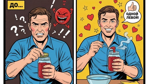ОДНОЙ ЛЕВОЙ Как открыть любую банку с закручивающейся крышкой (даже если она «заварена») Представьте: вечер, вы достали маринованные огурцы, или джем, или любимую пасту, а крышка словно приклеена. Вы пытаетесь повернуть её, сжимаете руку до боли, крышка не двигается, и вы чувствуете, что сейчас просто взорвётесь от досады. Вам кажется, что нужна недюжинная сила. Но это не так. Секрет заключается не в силе, а в технике и физике. Все эти трюки можно выполнить буквально одной левой, используя самые базовые принципы и предметы, которые есть у вас на кухне...