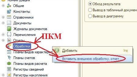 Способ 1. Добавление внешней обработки в конфигурацию. Для этого в дереве конфигурации нажимаем ПКМ по Обработки и нажимаем Вставить внешнюю обработку, отчет... . В окне Открытие указать путь к внешней обработке и нажать кнопку Открыть. Если есть подсистемы, то добавить внешнюю обработку Консоль запросов в подсистему...