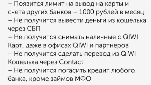 Пресс-служба QIWI информирует: Перевод денег на другие кошельки, пополнение счетов мобильных операторов, оплата услуг и товаров кошельками и картами QIWI работают в обычном режиме. Денежные переводы Contact, торговый эквайринг и выплаты на сторонние счета и карты от юридических лиц ограничения также не затрагивают. Мой способ: Как вывести деньги с Qiwi с минимальными потерями Нам понадобятся: Дело за малым: С Qiwi кошелька пополняем мобильный номер МТС, а затем переводим эти деньги на карту МТС банка с комиссией 0,9%, тем самым по максимуму сохраняем свои средства...