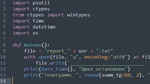 Всем привет! На работе была поставлена задача отслеживать время работника в определенных программах для статистики, таких как Почта, Телеграм, Браузер и так далее. Немного поискав в интернете информацию, я понял, что не так уж это и сложно реализовать! Возможно кому то пригодится и будет полезно! Начнем! По традиции расскажу про библиотеки которые понадобятся: psutil - библиотека для получения информации о запущенных процессах, она конечно еще кое что может, но нам пока достаточно. ctypes - из нее...