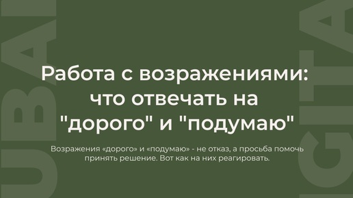 🟢 Как отвечать на частые возражения клиентов  Возражения «дорого» и «подумаю» - не отказ, а просьба помочь принять решение. Вот как на них реагировать.  ➡️ На возражение «Дорого»  1. Выясните причину - «По сравнению с чем дорого?» - «Какой бюджет вы рассматриваете?»  2. Покажите ценность - «Да, это дороже аналогов, потому что...» - «Наш клиент после покупки экономит...»  3. Предложите варианты - Рассрочку или оплату частями - Базовую версию продукта - Дополнительные бонусы  Пример диалога: — Дорого...