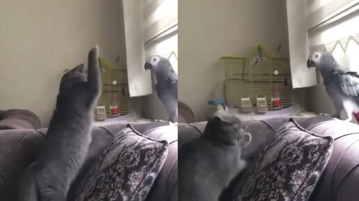 Попугай научился пародировать голос хозяина и успокаивать кота