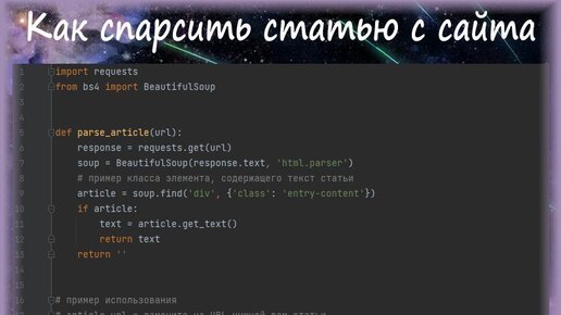 Пример простого кода на Python для парсинга текста статей с веб-сайта с использованием библиотеки BeautifulSoup. В данном примере мы делаем HTTP-запрос к указанному URL (одна статья с моего сайта), затем используем библиотеку BeautifulSoup для разбора HTML-кода и находим нужный элемент, содержащий текст статьи (в данном примере предполагается, что текст находится в элементе с классом 'entry-content'). Затем мы используем метод `get_text()` для получения чистого текста статьи. Чтобы найти класс, содержащий текст статьи, вам необходимо сохранить веб-страницу со статьей в формате html...