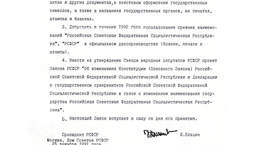 25 декабря является Днем образования Российской Федерации (России). Именно в этот день, в 1991 году Борис Николаевич Ельцин находясь в должности Президента РСФСР подписал Закон 2041-I "Об изменении наименования Российской Федеративной Социалистической Республики в Российскую Федерацию (Россия)". В законе 2041-I от 25.12.1991 года указывается, что данный Закон создан на основании Постановления Верховного Совета РСФСР, но данного Постановления - нет. И никогда не было. Мы с товарищами просмотрели архивы Российской Федерации, советские газеты и ничего там не нашли...