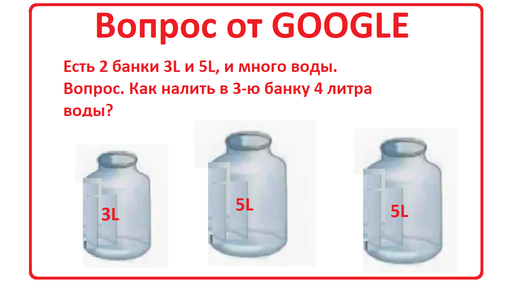 Приветствую читателей и подписчиков канала Тесты_математика! Публикую задачу, обозначенную, как задачу от GOOGLE, которую задают при приёме на работу в данную американскую кампанию, в числе многих других. Задача. Есть две банки, ёмкостями 3L и 5L, и есть много воды (что немаловажно). Вопрос. Как налить в третью банку 4 (четыре) литра воды? На рисунке показаны две банки (ёмкости) с обозначенными объёмами 3L и 5L , и также показана ёмкость в 5L, в которую и нужно наливать ту воду, которую отмерили первыми двумя емкостями...