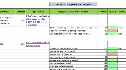Не редко возникает ситуация, когда необходимо перенести данные из одной таблицы в соответствующие ячейки другой. Как говорится, ничего сложного, пока тиких данных немного. В противном случае - это проблематично. А когда данное действие нужно делать несколько раз в неделю, это уже очень сильно напрягает и отнимает уйму времени. Так и в моем случае, мне понадобилось еженедельно отслеживать позиции своего сайта planero.ru по нужным ключевым словам. И если съем позиций сайта в выдаче Яндекса я осуществляю...