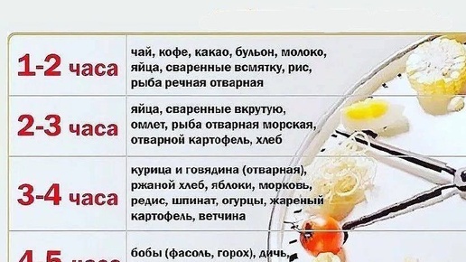 ⏰ Сколько переваривается еда в желудке — таблица, которую стоит знать каждому! Оказывается, наш желудок трудится с разной скоростью — всё зависит от того, что именно мы съели. 🍽 🥛 1–2 часа: чай, кофе, бульон, молоко, рис, рыба речная, яйца всмятку. 🍞 2–3 часа: яйца вкрутую, омлет, морская рыба, картофель, хлеб. 🍗 3–4 часа: курица, говядина, яблоки, морковь, огурцы, жареный картофель...