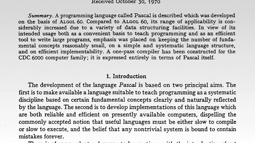 (с) Перевод: Ф.В.Ткачев, 2020-02-06 Язык программирования Паскаль завоевал всемирное признание. В связи с его 50-летием я хотел бы сказать несколько слов о его создании, распространении и дальнейшем развитии. Обстоятельства создания В начале 1960-х гг. доминировали языки Фортран (Джон Бэкус, IBM) для научных, и Кобол (Джин Саммет, IBM и Министерство обороны США) для коммерческих приложений. Программы писались на бумаге, потом пробивались на перфокартах, а результатов нужно было ждать примерно день...