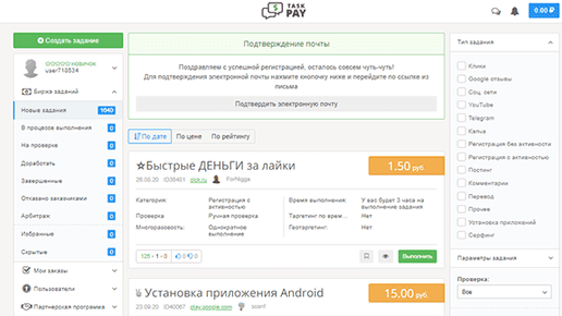 TaskPay - это один из самых лучших сайтов для заработка на заданиях. Чем же хорош этот проект? Сейчас расскажу. Для начала надо зарегистрироваться. Вводим электронную почту, пароль, повтор пароля и аккаунт создан. На это сайте огромное количество заданий, которые можно выполнить без особого труда. За день здесь можно заработать от 100 рублей. В среднем оплата за задание от 1 до 10 рублей, но есть и задание за 50 рублей, за 100 рублей и т.д. Задания разделены на 13 типов: "Клики", "Google отзывы", "Соц...