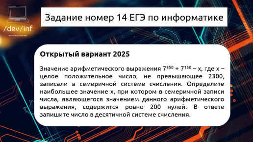 В задании номер 14 ЕГЭ необходимо получать запись числа в системе счисления с разными основаниями. Поэтому встроенной функции питона bin() уже недостаточно. Необходимо писать алгоритм перевода. Рекомендую не учить алгоритм, а писать его на основе "ручного" перевода чисел: делить число нацело пока от него не останется 0 и выписывать все остатки от деления в обратном порядке. Рассмотрим задание из открытого варианта 2025. https://openfipi.devinf.ru/task/3F4398 Необходимо посчитать количество нулей в семеричной записи...