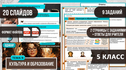 Комплект создан по теме «Культура и образование» состоит из презентации (20 информативных слайдов) и рабочего листа (9 интересных, разноплановых заданий). Материал разработан по ФРП «ОДНКНР для 5 классов» тематический блок 1. п/п 1.9. (тема 9) Комплект представлен в PDF-формате и PPTX-формате. Включает 9 заданий + ответы для учителя. Подходит для печати на черно-белом принтере. Список заданий: -------------------------------------------------------- Состоит из 20 ярких и информативных слайдов. Содержание презентации по слайдам: Слайд 1...