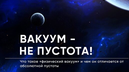 Тот факт, что большую часть космического пространства занимает вакуум, известен науке довольно давно. В переводе с латыни это слово означает всего лишь «пустота», то есть #вакуум – это пространство, лишенное всякого вещества. Однако, человек привык обитать в довольно плотной, хоть и прозрачной атмосфере, которую чаще всего даже не замечает. Поэтому наглядно представить себе полную пустоту довольно трудно. Так что же из себя на самом деле представляет физический вакуум? Естественно, идеальной пустоты...