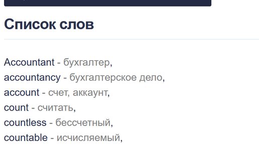 Список его однокоренных слов: COUNT (глагол) - считать Примеры использования в предложениях: УЗНАТЬ БЫСТРО ПОДБРОБНЫЙ СПИСОК ВСЕХ ОДНОКОРЕННЫХ СЛОВ МОЖНО ПО ПОИСКУ: https://блог.лингваассистент.бел/wordformation...