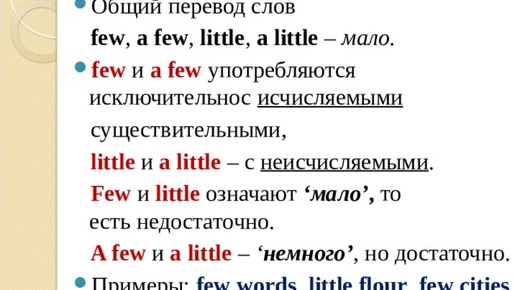 "A little" и "little" оба переводятся как "немного", но они имеют разные оттенки значения и используются в разных контекстах. Давайте рассмотрим, как и когда использовать каждое из них. "A little" используется, когда небольшое количество чего-то достаточно или приемлемо для ситуации. Это выражение имеет положительный оттенок и показывает, что чего-то достаточно для чего-то. "A little" подчеркивает, что небольшое количество чего-то вполне удовлетворяет нужды. "Little" используется, когда количество чего-то настолько мало, что недостаточно или неудовлетворительно...
