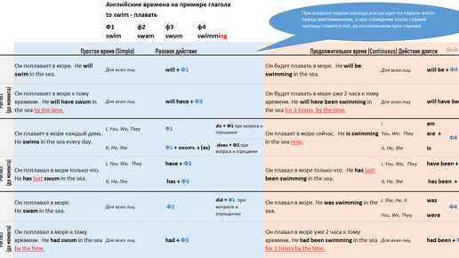 Глагол swim (swam, swum, swimming) — плавать
