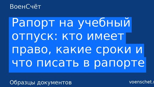 Рапорт на учебный отпуск подают военнослужащие, которые учатся или поступают в гражданские образовательные организации по заочной или очно-заочной форме, а также те, кто проходит вступительные испытания. Такой отпуск — дополнительный, он не уменьшает основной, однако оформляется строго по правилам: на основании справки-вызова из учебной организации и, при необходимости, справки о праве на обучение, которые вместе подтверждают законное основание для предоставления именно учебного, а не обычного отпуска...