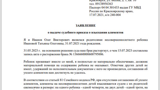 Алименты на ребенка, заполняем образец заявления на судебный приказ вместе с юристом за 8 минут