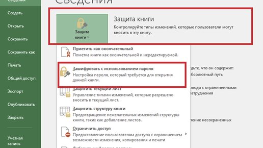 Всем привет! Сегодня я расскажу о защите файла (или как еще называется "книги") Эксель. В Excel предусмотрен функционал, позволяющий защищать документы от открытия нежелательными лицами. Эта возможность позволяет защитить файл паролем. Для реализации данной защиты нужно пройти в основном меню в позицию «Файл», нажать пункт «Защита книги» и выбрать позицию «Зашифровать с использованием пароля». В открывшемся окне нужно внести пароль для открытия файла...