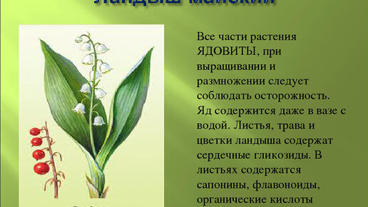 Старинное поверье гласит: небольшой букетик ландышей, поставленный у изголовья кровати, дарует счастливую жизнь супругам. Нежные ландыши с божественным ароматом под силу вырастить даже начинающему цветоводу. Ландыши — ядовитые растения Все части растения содержат сильные яды, воздействующие на сердечно-сосудистую и пищеварительную систему. Даже лёгкое отравление сопровождается рвотой, диареей, головной болью и нарушениями работы сердца. Отравление средней степени может оказаться фатальным. Передозировка...