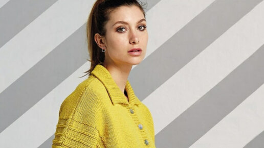 Всем доброго времени суток! Последнее время всё большую популярность приобретают изделия с укороченной планкой и отложным воротником. Стильный пуловер свободного фасона прекрасно подойдет и к неформальному, и к деловому стилю одежды. ШИРИНА ИЗДЕЛИЯ ПО ОБХВАТУ ГРУДИ. 110 (114) 118 (123)см. ДЛИНА ИЗДЕЛИЯ. Примерно 55 (56) 57 (59)см. ПОТРЕБУЕТСЯ. Пряжа (50% хлопка, 50% шерсти; 50 г/100 м) — 10 (10) 11 (12) мотков желтой; спицы 4,5 и 5. СПИНКА. На спицы №4,5 набрать 101 (105) 109 (113)п. и связать 1-й ряд (= изн...