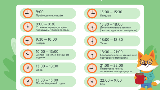 Распорядок дня является важным элементом нашей жизни. Он помогает нам организовать время и эффективно использовать его для достижения наших целей. Хотя каждый человек имеет свой уникальный распорядок дня, есть несколько общих правил, которые помогут вам создать эффективный график.  Во-первых, важно просыпаться и ложиться в одно и то же время каждый день. Это поможет вашему организму установить режим сна и бодрствования, что повысит вашу продуктивность.  Во-вторых, необходимо выделить время на занятия спортом или физическими упражнениями...
