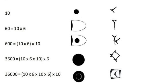 Подавляющее большинство систем счисления способны передавать большие числа. Нам привычна десятичная система с базами 10, 100, 1000 и т.д. Однако в языках мира существовали и существуют и другие системы. В частности, в древней Месопотамии шумеры и вслед за ними аккадцы использовали шестидесятеричную систему с базами 10 и 60. Месопотамское культурное влияние ощущается в нашей цивилизации и сегодня. Из этого источника мы получили 60 минут в часе и 360° в окружности. Месопотамская система имела две формы записи...