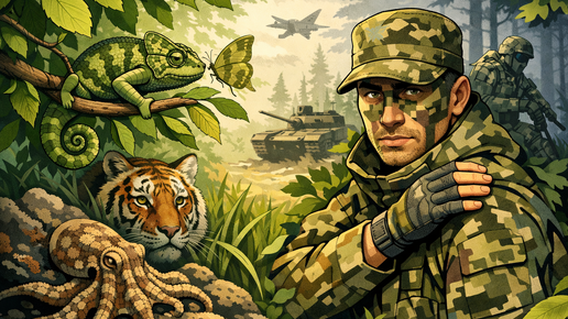 Представьте: вы стоите в лесу, всматриваетесь в кусты, но видите только траву, листья и ветки. А через секунду из этой «растительности» поднимается человек и кладет руку вам на плечо. Мурашки? А теперь представьте, что от этой способности — быть невидимым — зависят жизни солдат на войне. Камуфляж — это не просто модный принт, который любит носить суровый сосед из 90-х. Это сложная наука, искусство обмана и эволюционная гонка вооружений, в которой участвуют не только армии мира, но и… бабочки, тигры и осьминоги...