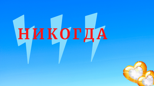 Что такое никогда? Такое простое слово. Оно означает что у него нет времени ни настоящего, ни будущего. Когда мы хотим что то забыть , выбросить , оставить мы всегда сетуем НИКОГДА. Никогда не буду больше так поступать Никогда не надену больше эти туфли. Никогда.Никогда. Никогда. И у Вселенной есть свои законы никогда, чтобы наша жизнь всегда была счастливой. 10 законов Вселенной НИКОГДА. 1.Никогда не делай поспешных выводов, основываясь на чужих домыслах. 2. Никогда не выноси "сор" из избы. 3. Никогда не верь сплетням...