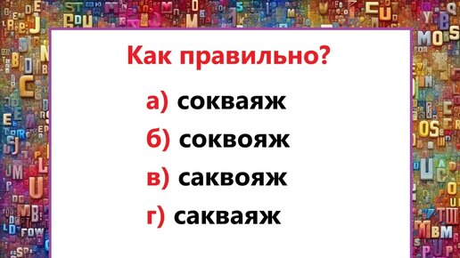 Знанием грамматики русского языка может похвастаться далеко не каждый носитель языка. А как у вас обстоят дела грамотностью? Предлагаем устроить себе проверку при помощи мини-теста по русскому языку. Перед вами словарное слово, ставшее причиной снижения оценки на многих диктантах. Написание его никак не проверить — остается только запомнить. Ваша задача — выбрать правильный вариант из четырех предложенных. Как правильно? а) сокваяж; б) соквояж; в) саквояж; г) сакваяж. Мы уверены, что вы справились на «пятерку»...