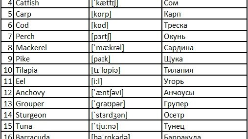 Сегодня небольшая подборка слов с названиями рыб. Существует огромное количество разных видов и подвидов этих представителей животного мира. В разных частях света разные условия и соответственно разные видя рыб там обитают. Например, какой-нибудь чебак водится в России, но в США или Великобритании его нет, поэтому и в английском языке такое слово может отсутствовать. Поэтому список по данной теме получился небольшой, только основные, широкоизвестные виды рыб...