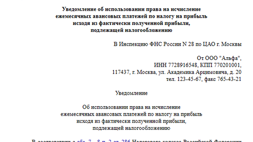 На этот вопрос вам нужно ответить до конца 2023 года. Выбирайте между традиционной системой: квартальные авансы с уплатой ежемесячных платежей (кто может не платить авансы помесячно, читайте здесь) или ежемесячные авансы по фактически полученной прибыли. Подробнее про все варианты читайте в статье «Авансовые платежи по налогу на прибыль: кто платит и как рассчитать?». Если меняете авансовую схему на 2024 год, подайте в налоговую уведомление. Форма уведомления — произвольная. Можете взять, например, образец от «КонсультантПлюс»...