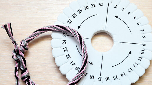 Всем привет. В этом мастер-классе я покажу, как сплести трёхцветный объёмный браслет в технике кумихимо. Нам понадобятся 8 отрезков шнуров трёх цветов по 1 метру толщиной 1 мм. Я взяла 2 чёрных, 2 серых и 4 розовых. Складываем все вместе пополам и завязываем аккуратный узелок. Это будет наша петелька для завязок будущего браслета. Этот узелок помещаем в отверстие диска и начинаем распределять нити согласно схеме. Все готово к работе, начинаем плести. Берем правую верхнюю чёрную нить и опускаем вниз, закрепляем в свободную прорезь справа от нижних нитей ...