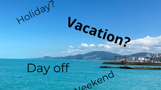 Поскольку все эти слова связаны со временем, когда не нужно идти на работу, то их часто путают. Хотя разница между некоторыми из них есть, а иногда и даже очень приличная. Что ж, попробуем разобраться: Holiday Отпуск. Употребляются варианты и holiday, и holidayS, но в сочетании с предлогом ON, возможен только holiday. HolidayS - это множественное число от слова holiday Также эту форму часто можно встретить со школьными каникулами (school holidays/summer holidays) и в значении ‘рождественские праздники’ в конце декабря- в начале января...