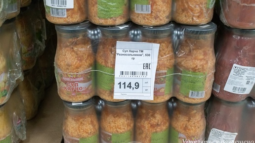 Стопки в магазине Расскажу ка я вам историю, основанную на реальных событиях. Вы уже, наверное, читали и смотрели мои обзоры посещения магазина Низкоцен в Ростове. Если нет, то в самом окончании будет у вас такая возможность. А пока возвращаемся к моему проступку. На огромных торговых площадях магазина, прям на поддоне, укутанные в полиэтилен стояли банки, в которых и был суп с именем Харчо в цене 114,90 рубля за единицу товара. так цена виднее Купил значит я баночку супа Харчо торговой марки Разносольников...