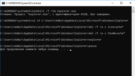 Любители кастомизировать ярлыки наверняка сталкивались с повреждением изображений иконок как на рабочем столе, так и в проводнике Windows. Решить данную проблему можно буквально за минуту с помощью сброса кэша через командную строку операционный системы. Запускаем командную строку (cmd.exe) от имени администратора и построчно вводим следующее: taskkill /f /im explorer.exe Таким нехитрым способом мы завершаем процесс "Проводник". Это необходимо для удаления файлов кэша, в противном случае система не даст удалить используемые файлы...