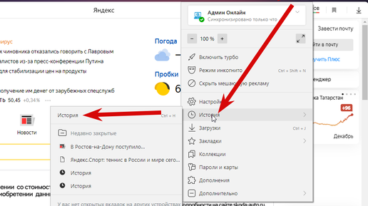 Справа вверху нажимаем три горизонтальные полосочки - История - История