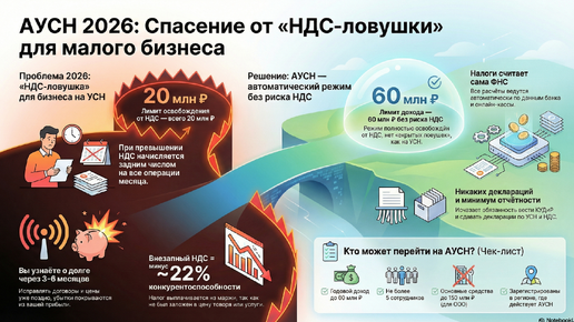 1. Введение: какую проблему АУСН решает в 2026 году В 2026 году малый бизнес оказался в новой реальности. Формально всё выглядит так же: можно работать на УСН, лимиты УСН выросли, отчётность знакомая. Но на практике произошёл перелом, который почувствуют все предприниматели, особенно те, чей денежный поток быстро растёт. Главный удар — это лимит в 20 миллионов рублей для освобождения от НДС по ст. 145 НК РФ.